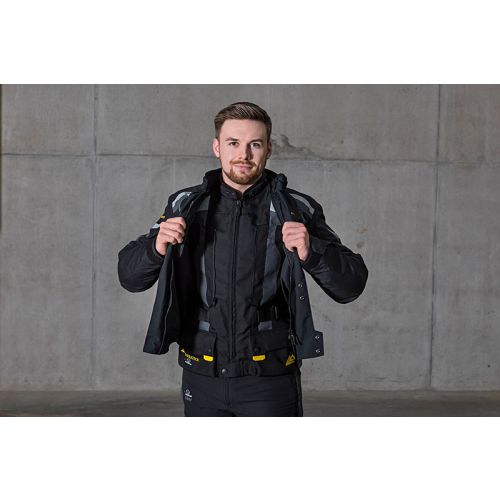 The renowned clothing manufacturer's vast wealth of experience was just what we needed to implement our ideas. The requirements for the Compañero World2 were jointly defined. It was vitally important that the suit allowed maximum ventilation for physical exertion at high temperatures. On the other hand, it needed to be completely wind and waterproof in adverse conditions. The rider's passive safety was high up on the list too, of course. Features such as variable widths for the perfect fit, adjustable cuffs and zips etc. could be taken for granted in a joint development like this by two expert partners such as Touratech and Stadler. If you wanted to sum up the basic concept of the Touratech suit in a nutshell, it would be "3 in 1".