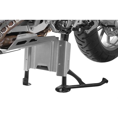 The engine guard extension also protects parts of the exhaust from stones and other kinds of dirt that get thrown up. Also really useful in road use! The many angles of the 4-mm thick aluminium sheet provide maximum stability. There is no restriction of ground clearance. The *Expedition* engine guard extension attaches to the main stand in moments.