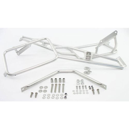 The pannier rack is fastened via two struts to the right and left of the rider's footpeg holder. There are two additional struts on each side of the rack to prevent the pannier rack from twisting. One strut would not be enough to give the rack the necessary stability. The two rack elements on the right and left are screwed together by a bar behind the number plate mounting. The position of the rack was chosen to make sure that even with panniers in place, there would still be enough room in tight bends.The fitted width of the pannier rack is 48 cm. The pillion footpegs can be fitted directly to the pannier rack.