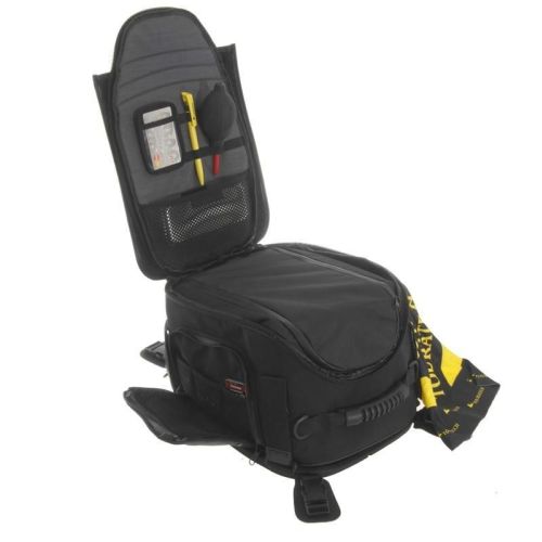 A large map case (12 x 10 inches) is affixed to the top with Velcro®. If you want to leave the tank bag at home, simply velcro the map case onto the base plate.