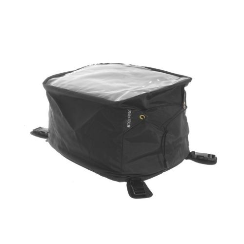 This tank bag offers various storing possibilities: Two outside pockets with special compartments for memory cards and an additional outside front pocket for the included transparent rain cover; a tiny bag the size of a credit card inside of the top flap; another sewn-in bag for larger items; and several rubber bands for holding pens. The tank bag has a carrying handle and is fixed to the base plate with Velcro, which keeps it from moving around even on rough terrain. Four included straps fit onto quick release buckles and allow various ways of securing it to your bike. A particular advantage is that the inner bag converts into a shoulder bag, and the tank bag into either a backpack or shoulder bag, so you can more easily carry it along with your other motorcycle gear.