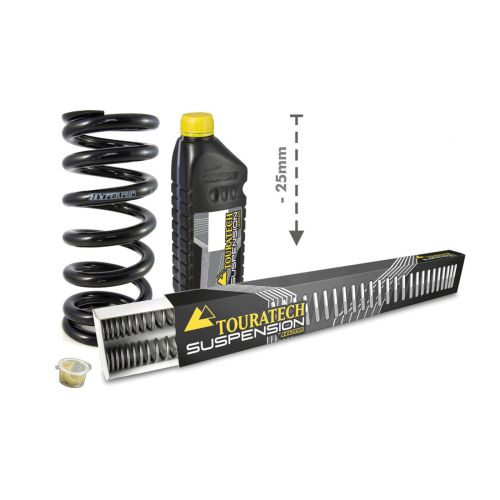 The height lowering kit by Touratech Suspension. The set includes replacement fork springs and a replacement spring for the shock absorber. This spring set provides you with a sensible reduction in height without affecting the riding properties - at the expense of a little ground clearance. The progressive springs have been designed to match your motorbike perfectly, and offer a tremendous improvement in response and greater safety in extreme situations. Replacing the front and rear springs will lead to a significant improvement in your suspension system. Street legal.