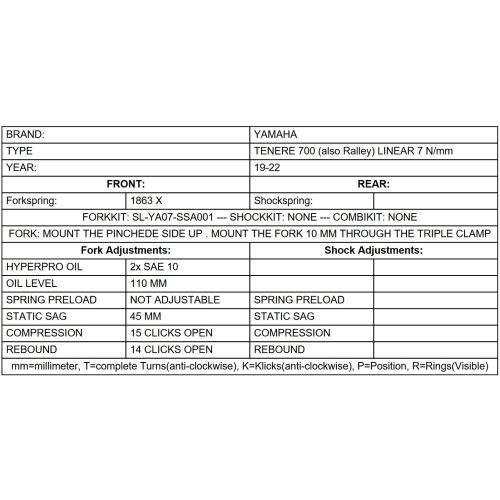 Fork springs LINEAR (7N/mm) for Yamaha 700 Ténéré (2019-2024), *Adventure Set Up*.