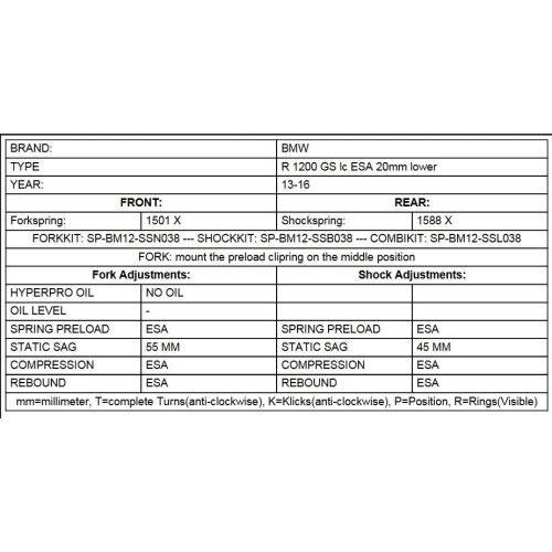 The height lowering replacement springs has been designed to match the BMW R1200GS(LC)perfectly This spring set provides you with a -20mm reduction in height without affecting the riding properties - at the expense of a little ground clearance. The progressive springs have been designed to match the original shocks BMW R1200GS(LC) perfectly, and offer good response and safety in extreme situations. The balance of your motorcycle remains fully intact..
