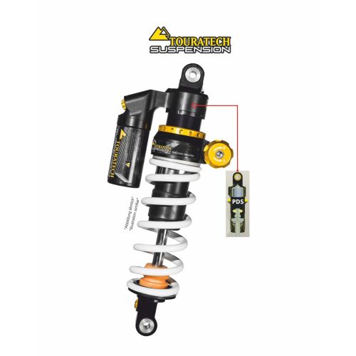The Touratech Suspension Extreme shock absorber ranks in the absolute premium class of suspension components. This Extreme shock absorber for the KTM 790 Adventure R / KTM 890 Adventure R is perfectly suited to touring and riding with frequent dramatic changes in loading and riding conditions, and the most extreme demands. The Extreme shock absorber is fitted with a position sensitive damping system (PDS), which utilises a second damping piston to provide hydraulic protection against bottoming out. Even fully laden with luggage under the most extreme off-road conditions, the bike will not bottom out and the shock absorber is protected against mechanical overload. Damping characteristics change depending on the road surface. When riding under most conditions, the shock absorber is comfortably adjusted for a less strenuous ride, before the PDS kicks in for the last portion of the shock absorber stroke.